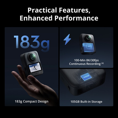 Captura videos de 360° con calidad cinematográfica y fotos de 8K con el ultracompacto Combo Estándar de Cámara de Acción Osmo 360 de DJI. Esta potente incorporación a la línea de cámaras Osmo ofrece lentes duales para vistas de 360° y un gran sensor de 1″ que captura videos de hasta 8K30 y fotos de 120 MP con un rendimiento excepcional en condiciones de poca luz. Su brillante pantalla táctil de 2″ ofrece vistas previas nítidas y controles táctiles fáciles de usar.