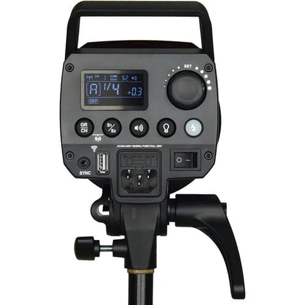 El MS300 pesa 5.7 lb, lo que fomenta el ensamblaje de un kit con dos o más cabezales sin tener que cargar un estuche pesado. El MS300 tiene un soporte de accesorio frontal Bowens, lo que le permite usar modificadores Godox, así como accesorios de los muchos fabricantes que usan este sistema. El cabezal tiene un soporte de soporte inclinable y funciona con una alimentación de 110 a 240 VCA.