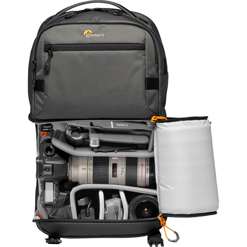 La Fastpack Pro BP 250 AW III de Lowepro es una mochila versátil con dos compartimentos principales, incluyendo un compartimento para cámara en la base, ideal para una cámara réflex digital o sin espejo con cuatro o cinco objetivos, incluyendo un objetivo 24-70 mm f/2.8. Su posición permite acceder a él girando la bolsa de atrás hacia adelante con el lado izquierdo hacia arriba. La abertura con cremallera y desprendible del compartimento para cámara incluye un sistema de clip interno que permite acceder solo por los laterales. Como alternativa, el sistema de clip se puede soltar para abrir y retraer completamente la abertura, permitiendo un acceso completo al compartimento para cámara, por ejemplo, al colocar la bolsa sobre una superficie plana con las correas hacia abajo. Sobre el compartimento para cámara, un compartimento superior con cremallera permite guardar ropa plegable y bolsillos organizadores para documentos de viaje, baterías, tarjetas de memoria o pequeños dispositivos electrónicos.