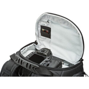 Esta mochila cuenta con cuatro puntos de acceso: acceso completo por la espalda, acceso superior y acceso completo por ambos lados. El cinturón extraíble puede usarse como cinturón multiusos profesional y alberga la bolsa multiusos, el portabotellas y el soporte para trípode incluidos.