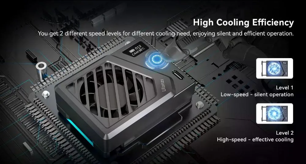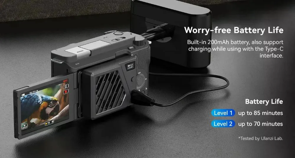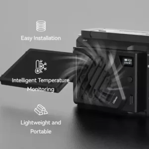 Mantente siempre informado con la pantalla OLED de 0.46 pulgadas integrada, que te permite monitorear en tiempo real la temperatura de la cámara y el nivel de velocidad del ventilador. Además, su batería incorporada de 200mAh ofrece una autonomía confiable (hasta 85 minutos en Modo 1 y 70 minutos en Modo 2), y gracias a su interfaz Tipo-C, puedes conectar una power bank externa para una carga continua mientras trabajas, asegurando una vida útil de la batería sin preocupaciones.